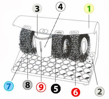 Chổi màu (chổi đánh bóng) ở bên trái và bên phải của máy dùng đánh bóng giày sau khi lấy xi.